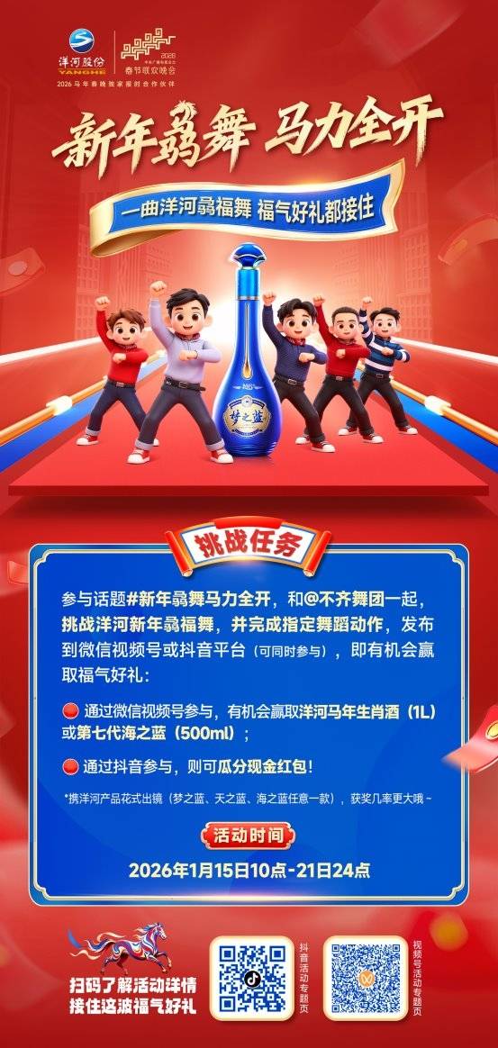 1月15日—21日,由不齐舞团原创编舞的“洋河骉福舞”挑战赛,同步登录抖音和微信视频号双平台,直接燃炸这个新年!